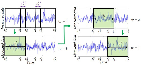 A sequential estimation window approach is used in this study to improve the efficacy of the estimation process. In this approach, the time domain is divided into successive overlapping estimation windows. The estimation window spans from time step to time step , and is the length of the estimation window. Also, the overlap between the and estimation windows is defined as . The estimation problem is solved at each estimation window iteratively to estimate the mean vector and covariance matrix of the unknown parameter vector and then moves to the next estimation window until completion. The estimates of the unknown model parameters at the end of each estimation window are transferred to the next estimation window and used as initial estimates. However, to transfer the estimates of FIMs, each estimation window is divided into two parts. The estimates of FIMs in the first part, spans from to in the estimation window, which does not overlap with the next estimation window, are considered as final estimates. The second part overlaps with the next estimation window, spans from to in the estimation window, and the estimates of FIMs in this part are transferred to the next estimation window to be considered as initial estimates. The sequential estimation window approach is schematically shown in Figure 2 and further discussed in the following section.