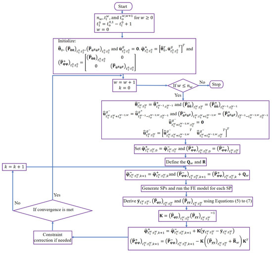 In Equations (5)–(7), and are the mean and covariance weighting coefficients [26], respectively, and is the FE-predicted response at the estimation window evaluated at . Now, the UKF prediction-correction procedure can be employed to estimate the posterior mean vector and posterior covariance matrix of parameter vector at the iteration. Moreover, to move from the estimation window to the estimation window, convergence criteria, including the maximum number of iterations at each estimation window and allowable convergence tolerance in the posterior mean vector, are checked. To avoid unphysical estimates of posterior parameters, a constrain correction approach based on [27] is also implemented. The model updating algorithm is summarized in Figure 3.