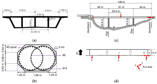 A precast reinforced concrete bridge, referred to as the San Roque Canyon (SRC) bridge, is used as a testbed to examine the efficacy of the model updating technique. The SRC bridge, located in Santa Barbara County, CA, crosses the San Roque Creek river and is a 149-m long continuous concrete box girder bridge with a 14-m wide deck and two lanes of traffic. The SRC bridge has two concrete piers with octagonal cross-section and seat-type abutments. The bridge deck and pier cross-sections are shown in Figure 4a,b. This bridge was instrumented in 1996 with six uniaxial accelerometers on the bridge and three uniaxial accelerometers at a nearby free-field station, see Figure 4c,d. Three out of six accelerometers on the bridge measure the response of the deck in the transverse direction (channels 6, 8, and 9), and one accelerometer records the vertical motion of the deck at its center (channel 7). The channels 4 and 5 record the longitudinal response of the abutment and deck, respectively. Also, channels 1, 2, and 3 are at the free-field to collect FFMs in the horizontal (channels 1 and 3) and vertical directions (channel 2).