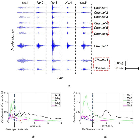 Since its instrumentation until 2021, SRC bridge has recorded seven earthquakes whose data is publicly available through the Center for Engineering Strong Motion Data (CESMD) [30]. However, only five earthquakes with Peak Ground Acceleration (PGA) greater than 0.01 g are available and all five earthquakes are considered in this study. These five earthquakes are listed in Table 1 along with their date, distance between the epicenter and the bridge, PGA, and Peak Structural Accelerations (PSAs) in different directions. The PGA for all the earthquakes, except for the 2004 IslaVista, are in horizontal direction. The recorded acceleration data for these five earthquakes are shown in Figure 5a, in which the measurement channels used later for the identifiability analysis and model updating are specified by red dashed lines. Moreover, the pseudo spectral acceleration for FFMs in transverse and longitudinal directions considering 5% damping ratio are shown in Figure 5b,c. The period of the first longitudinal and transverse modes of SRC are also shown in this figure.