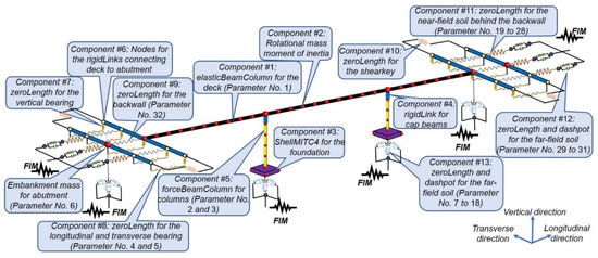 A detailed FE model of the SRC bridge is developed in OpenSees [31] following the guidelines provided in [32]. All the nominal material properties are taken from the as-built structural drawings and Caltrans Seismic Design Criteria [33]. Figure 6 is a schematic representation of the FE model, in which the model components are numbered from 1 to 13 and explained in the following text. Moreover, the model parameters are numbered from 1 to 34 and their nominal values are listed in Table 2.