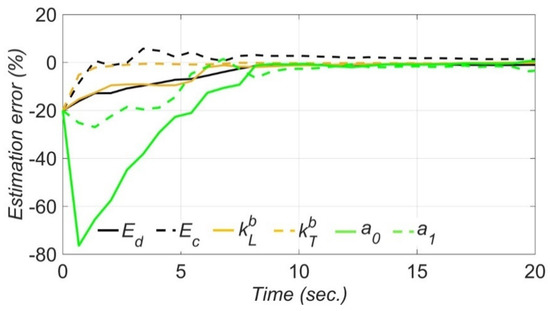 and the nominal values are shown in Table 2. The assumed −20% deviation of model parameters from their nominal values is chosen as a reasonable initial error based on engineering judgement. The final estimates of the model parameters are sensitive to the initial estimates. However, as long as the initial estimates are not unreasonably far from the nominal values, no significant change in the final estimates is expected [44]. The term is set as a diagonal matrix with diagonal entry equal to , while is the entry of . Moreover, is also initialized as a diagonal matrix with diagonal entries equal to . The first diagonal entries in are equal to , where is the entry of the, and the rest are time-invariant and equal to —note that the term refers to the estimate of model parameter vector at the estimation window. Finally, the diagonal entries of the simulation error covariance matrix,, representing the measurement noise variances, are set as . Moreover, the maximum number of iterations and the allowable convergence tolerance are selected equal to 9 and 0.02. These thresholds are based on experience to achieve a compromise between estimation accuracy and computational demand.