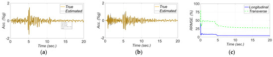 The estimated FIMs in the longitudinal and transverse directions are compared to their true counterparts in Figure 10a,b, respectively. Moreover, to evaluate the accuracy of the estimated FIMs, the Relative Root Mean Square Error (RRMSE) of the estimated FIM time histories are shown in Figure 10c. The RRMSE at time is calculated as