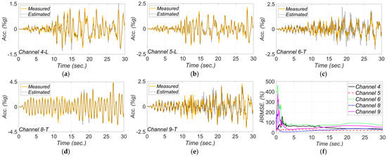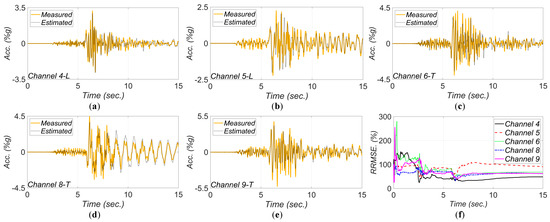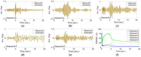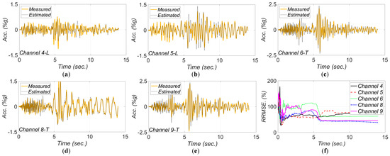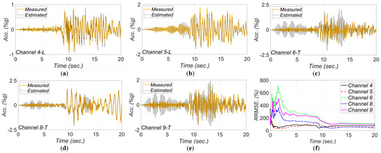 Comparison between measured and estimated (from updated model) responses at different measurement channels for 2018 Santa Cruz earthquake: (a) channel 4, (b) channel 5, (c) channel 6, (d) channel 8, (e) channel 9. Part (f) is the corresponding RRMSEs.