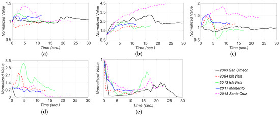Estimation time histories of (a) , (b) , (c) , (d) , and (e) for different earthquakes. The estimates are normalized to the initial estimates.
