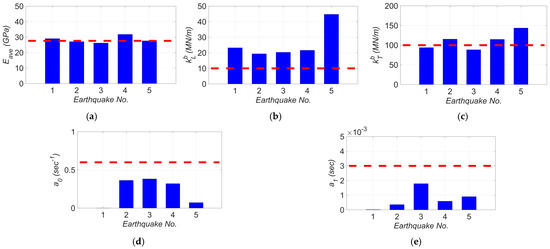 The variation in final estimates of (a) , (b), (c), (d) , and (e) for different earthquakes. The red dashed lines show the nominal values.