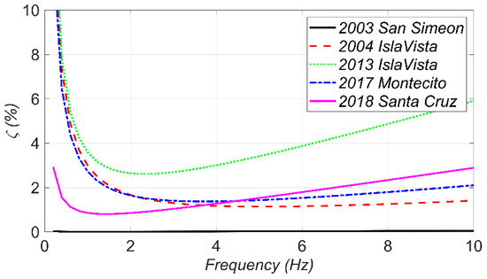 The final estimates of the Rayleigh damping ratio as a function of freqeuncy for different earthquakes.