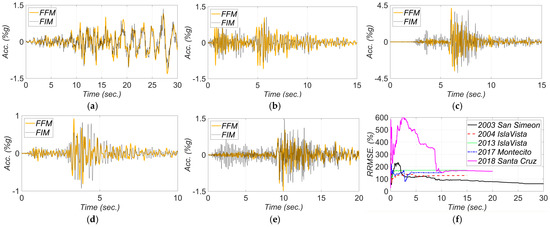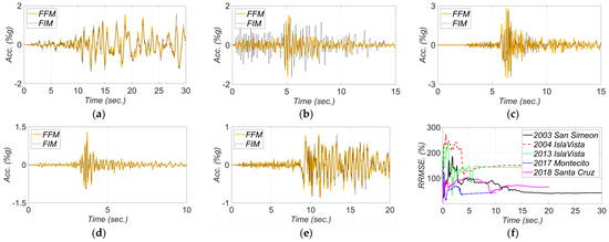 Comparison between the recorded FFMs and estimated FIMs in the longitudinal direction for (a) 2003 San Simeon, (b) 2004 IslaVista, (c) 2013 IslaVista, (d) 2017 Montecito, and (e) 2018 Santa Cruz, earthquake events. Part (f) is the RRMSE between the estimated FIMs and recorded FFMs.