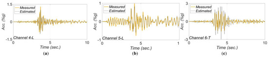 Figure 17, Figure 18, Figure 19, Figure 20 and Figure 21 show the comparison between the measured and estimated (from the updated models) acceleration responses. As seen, the predicted responses match well the measured responses in all events. However, as previously discussed in Section 3.3 and can be seen in the following figures, the accuracy in estimation of the responses is poor at the beginning of the earthquake event and improves in time.