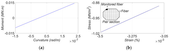 The updated FE model is a replicate of the SRC bridge in the digital world given the training data, and is referred to as its digital twin (DT). The DT can be used to reconstruct local element- and material-level responses to diagnose damage at local levels of the bridge. For this purpose, the DT is used in a forward simulation for a given input motion and the local responses (e.g., section moment curvature, material stress-strain) are collected and used for damage localization and quantification. The process is often referred to as virtual sensing [45]. Although the level of available earthquake motions was small in this study and thus, no damage is expected in the structure, the application of the DT can still be demonstrated. It should be noted that the phrase “Digital Twin” may have different meanings and applications in different industries. Here, the digital twinning method is used for post-earthquake assessment of bridges. The data recorded in seismic events are considered as discontinuous real-time data assuming that no significant changes will happen between the events. Therefore, the DT will be updated after each seismic event and used for post-earthquake damage diagnosis. In this section, the SRC DT is established using the final estimates of the unknown model parameters from the 2013 IslaVista earthquake data (earthquake No. 3). Then, the estimated FIMs are used with the DT to monitor/estimate the structural responses. Figure 22 shows two examples of such monitored/estimated responses at local levels. Figure 22a presents the estimated moment-curvature response at the lowest section of the east pier about the transverse direction. Also, the predicted stress-strain response of the extreme concrete fiber at the lowest section of the west pier is shown in Figure 22b. As can be seen, the structure behaves in its linear-elastic regime during the 2013 IslaVista earthquake. However, a similar concept is applicable for stronger earthquakes to monitor the response nonlinearity at the local levels to infer potential damage location and extent.