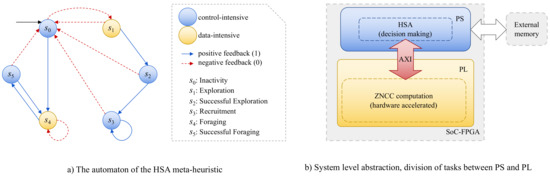 As previously stated in this paper, SoC-FPGA platforms are composed of two high-level components that are physically located on the same chip: the PL, which allows the emulation of a described electronic design; and the PS, which contains a dual-core ARM Cortex-A9 processor. Depending on the expected gain when parallelizing, we decided to perform certain HSA tasks in the PS and others in the PL in this case. The automaton (depicted in Figure 2a) and computational complexity analysis of Perez-Cham et al. [38] were critical tools that allowed the identification of the HSA meta-heuristic states or phases that benefit the most from hardware acceleration. Our conclusion was that the fitness function evaluation (ZNCC) is the part that incurs the most costs and has the greatest potential to be intuitively parallelized. As a result, this work proposes that the PS should perform HSA tasks related to intelligent coordinated decision making, whereas the PL should focus on ZNCC evaluation, corresponding to the exploration and foraging states (Figure 2b).