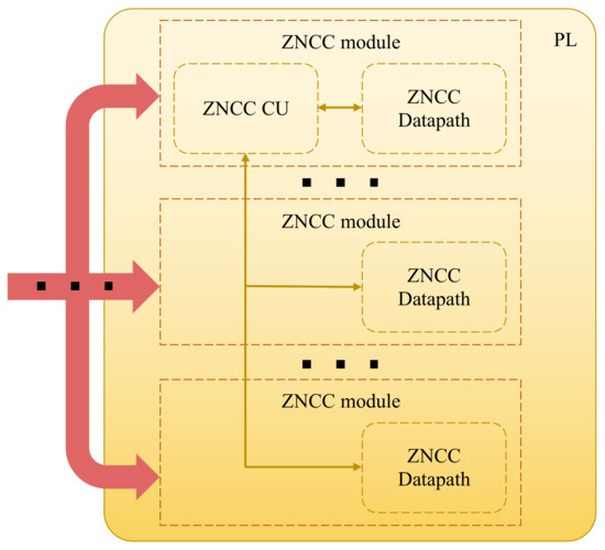 An illustration of how several ZNCC modules perform parallel processing, taking advantage of the capabilities of the PL. Each ZNCC module requires a datapath to perform operations simultaneously on different sets of input data, coordinated by a common control unit that oversees the execution of tasks following the SIMD parallel model.