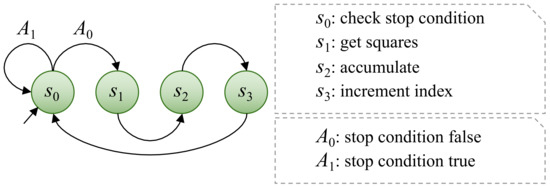 Because several of the sequential operations required to calculate a ZNCC value are summations, the accumulation CU (Figure 5) was created to control their sequential flow. The same control unit is used to guide two different summation phases that are taken into account in the overall flow provided by the ZNCC CU. This control unit is used to perform sequential integer accumulation in two cases: to obtain sums that will be used to calculate averages, and to obtain SSE and ZCC values. All averages can be evaluated in parallel, but SSE and ZCC require averages to be computed first. As a result, the design takes into account two accumulation phases. The Moore machine that describes this CU has four states , where is the state in which the stop condition is checked. Furthermore, during state , the CU waits for the BRAM to deliver the data that are currently being requested. The data received from the BRAM are then multiplied to obtain the square in state , if necessary. When the CU is in the state, the next step is to accumulate the value or the squared value. Finally, in state , a signal is provided to indicate that the process’s index should be incremented. There are only two input characters in the input alphabet A: the signal that indicates that the process is not complete () and the signal that indicates the opposite (). These input characters are used to indicate when the stop condition has been met, which is that the index is greater than the length of the array. In general terms, the behavior of this CU is very similar to a for-loop in common programming.