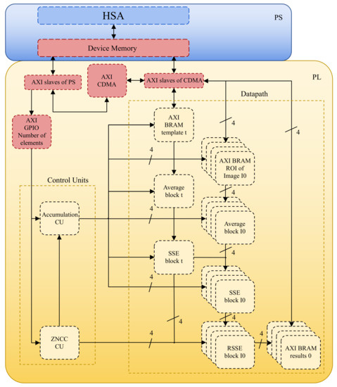 An illustration of the final interconnection of the ZNCC processing unit’s top-level blocks. Average blocks, SSE blocks, RSSE blocks, the accumulation CU, and the ZNCC CU are the key blocks that were implemented utilizing the PL. The communication between PS and PL is implemented using AXI, where CDMA is used to transfer image data and GPIO is used to transfer simple control data.