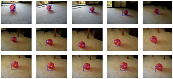 The ALOV benchmark recommends the detection of true positives and false positives in the evaluation process. This detection is based on a simple criterion, when , the truth of a video tracker is considered a true positive. Given that this criterion evaluates only one frame of a given video sequence, another metric, the F-score, is used to measure the outcome of the entire video. The F-score F is calculated using Equation (13), where is the number of true positives, is the count of false positives, and is the total of false negatives. Another ALOV benchmark recommendation is to use survival curve plots [62] to allow a simple visual inspection of the general trends observed in the F-score measurements of many video trackers with multiple video sequences. This same accuracy evaluation method is used in this paper.