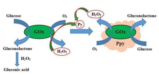Chemical synthesis of polypyrrole, which was performed by glucose oxidase (GOx) assisted polymerization, where H2O2 is formed by GOx and acts as an initiator of the polymerization reaction. Figure adapted from [50].