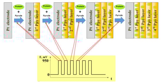 Electrochemical deposition of polypyrrole with simultaneously entrapped proteins using potential pulse-based technique, figure adapted from [50].