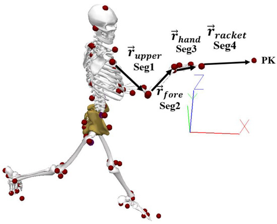 Participant’s virtual markers and derived vectors. Seg1 (segment 1: upper arm), Seg 2 (segment 2: forearm), Seg 3 (segment 3: hand), Seg 4 (segment 4: racket), Pk (centre of the racket).