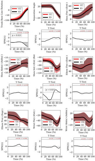 The means of the six repetitions in the CC and IO directions (72 forehand shots) for each participant of the selected kinematic (Table 1) and contribution (Table 2) variables of the upper arm, forearm, hand, and racket were calculated. Data were first tested for normality using the Shapiro–Wilk test (p < 0.05). Differences between variables having a normal distribution were accessed with a paired samples t-test and those that deviated from a normal distribution were assessed using a Wilcoxon Matched-Pairs Signed Ranks test to identify significant differences. For the paired t-test, the effect size (ES) was calculated as the Cohen’s d, where ≥0.2, ≥0.5, and ≥0.8, represent small, medium, and large effect sizes [27], respectively. For the Wilcoxon Matched-Pairs Signed Ranks test, the level of significance was set at p ≤ 0.05 and effect size (r) was defined as small for small effect ≥ 0.1, medium effect ≥ 0.3, and large effect ≥ 0.5 [28]. Significance was set at p ≤ 0.05 for all tests and all data are reported as mean ± SD. All statistical analyses were performed using SPSS version 20 (SPSS Inc. Company, Chicago, IL, USA). The kinematic differences between the two shots were also assessed using the one dimensional (1D) statistical parametric mapping (SPM). This statistical procedure identifies where significant differences occur during the entire waveform. More specifically, SPM-1D using a two-tailed paired sample t-test was used to compare each joint angle curve between the two directions of the shot from each participant. The SPM-1D method uses random field theory to identify field regions that co-vary significantly with the experimental design [29,30,31]. Differences were considered statistically significant for p-values < 0.05. All SPM analyses were performed in Python 2.7 using the open source package located at http://www.spm.1d.org/ (accessed on 20 December 2021) [32].