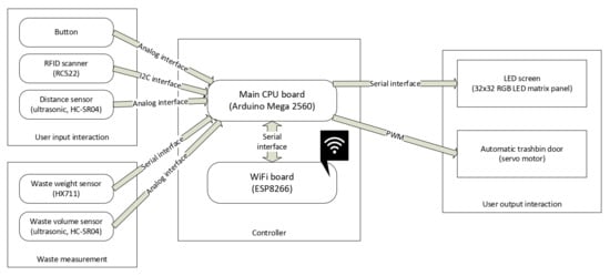 The smart waste bin development process put a particular attention on human experiences, allowing for various interaction modalities. The smart waste bin consists of the following modules: (1) controller, (2) waste measurement sensors, (3) user input interaction and (4) user output interaction modules.