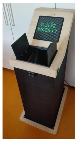 The core of the smart waste bin represents the controller, which is based on the Arduino Mega 2560 board in conjunction with the WiFi ESP8266 board. It enables all smart waste bin functionalities by a custom developed software (using Arduino IDE v1.8) and enables backend server wireless communication (IoT aspect). A waste measurement module allows for waste weight (up to 20 kg) and volume measurements (ultrasonic sensor). This information is sent to the cloud and presented to people interacting with the device. User input and output interaction modules provide the interaction capabilities. Different users can be identified by RFID technology (RFID tags or a mobile phone) thus allowing personalization. The user presence is detected by an ultrasonic distance sensor. In this way the smart waste bin is activated automatically, and only when required, thus conserving energy. Additional interaction is possible by two side-placed buttons. Relevant personalised (e.g., waste weight) information is shown on a large 32 × 32 RGB LED matrix display with a “retro” appearance. In this way, a simple graphical feedback is possible, providing the smart waste bin a personal touch by the visualization of a face. The waste bin lid opens automatically and when needed, making it easier to use. The casing of the smart waste bin was custom designed and made from laser-cut metal and wood material, and then enhanced by 3D printed components. The detailed smart waste bin architecture is shown in Figure 1 and the finished prototype in Figure 2.