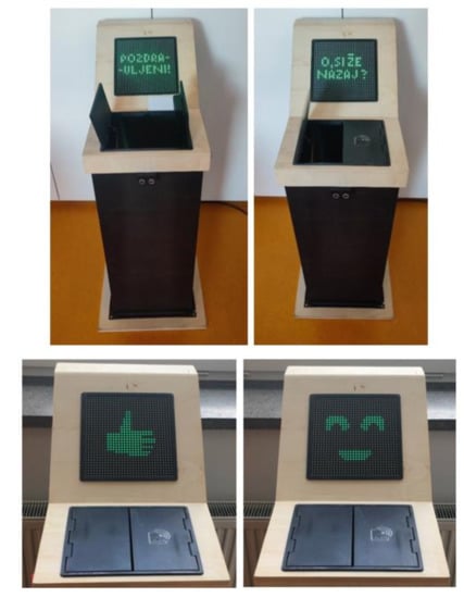 “In the first phase (when the card is placed on the sensor): ‘Hello, I collect organic waste, e.g., packaging and paper.’ When the flaps open: ‘Do you know that/insert an interesting fact/’? And finally, just before the flaps close: ‘Thank you for CORRECT waste management’ or ‘Thank you for CORRECT SORTING of waste’ or something similar.”