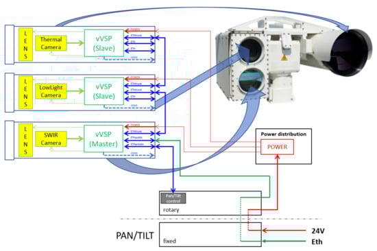 To overcome all the mentioned problems, we developed a new, highly integrated video signal processing platform in the form of a compact module, denoted as the Vlatacom Video Signal Processor (VVSP), which will expand the range of applications of advanced electro-optical systems. The module should enable the integration of key system components, enable managed communication and perform video signal processing using an efficient pipeline with minimized delay, while incorporating advanced video signal processing algorithms. Complex development includes the design of hardware, software, signal processing algorithms, network topology, as well as the method of integration into the system. Some early results about the VVSP module are presented in [17,18]. Today, the VVSP is a mature product integrated in multiple MSEOS, denoted as Vlatacom Multi-Sensor Imaging Systems, third generation (VMSIS3), which are shown in Figure 1.
