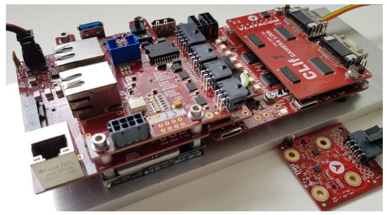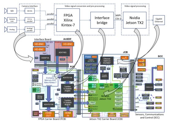 To enable communication with all components of the EO system, the VVSP must have appropriate interfaces integrated. The modularity of the VVSP module allows the interface to easily be changed and configured. The VVSP module allows the reception of images from cameras that use one of the following standard video interfaces: HD-SDI [23], CameraLink [24] and the analog composite PAL interface [25]. The maximum supported resolution format is 1920 × 1080 (FullHD) at 60 frames per second. The VVSP module can control all camera and lens parameters such as resolution, frame rate, gain, exposure, zoom and focus lens position, field of view adjustment (FOV), etc. The VVSP enables Pan/Tilt control, LRF, GPS, DMC, etc. The VVSP also has a special separate interface dedicated for communication with IMU sensors. As shown in Figure 3, the VVSP module consists of four separated PCBs: an interface board, an FPGA carrier board (FCB), a Jetson TX2 carrier board (JCB) and a board for Sensors, Signals and Control (SCC). The interconnection of these boards is achieved with high-quality board-to-board connectors that provide high data throughput in various ambient conditions.