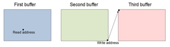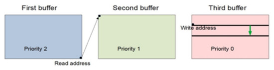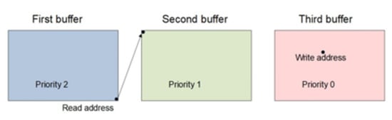 The logic in the read process to change the buffer must follow where the last frame was written, assigning priorities to the buffers when reading the last pixel in the current buffer. The highest priority is assigned to the most recently entered buffer (marked with priority 0), while the lowest priority is assigned to the oldest buffer (marked with priority 2). The logic is realized so that the reading process always passes into the buffer marked with priority 1. This is shown in Figure 6. Within the described realization, it is possible to repeat the buffer if the read process is faster than the write process. Additionally, if the write process is faster than the read process, then there will be a frame skip. In this way, it is ensured that the processes do not catch up with each other and that the frame does not freeze. The main disadvantage of this approach is the increase in delays.