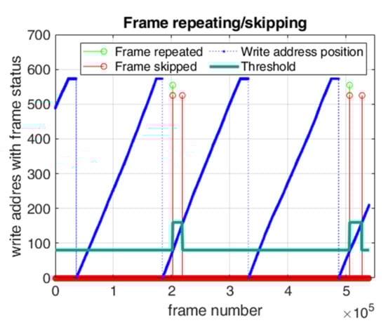 In Figure 8, the behavior of the system when modified triple buffering with hysteresis changes is applied is shown. With blue dots, the pointer for the write address is shown, and it travels from address zero to maximum address defined by the height of the picture that the camera gives on its output, which is to be transferred. When it reaches the maximum address, it stays for a length of time to wait for the next picture datum to arrive, since the frame is slightly larger than the useful part of the picture. Repeated frames are marked with a light green line, while skipped frames are marked with a red line, and the hysteresis limit is marked with a dark green line. When a change to the hysteresis limit occurs, the repetition of frames can happen as well as skipping of frames or both situations. The repetition and skipping of frames can only occur when hysteresis limits are changed, and it happens once in every 250,000 frames. In Table 1, the behavior of the system and the latency of transferred picture data in cases of single buffering, double buffering, triple buffering and modified triple buffering are shown.