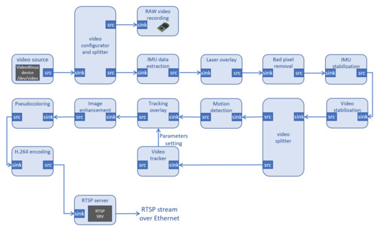 Gstreamer elements can have certain functionalities, such as a video signal configurator and splitter or an overlay layer. Additionally, they can be implemented as plugins that represent specific applied algorithms, including: bad pixel removal [33], video stabilization, IMU stabilization [10], object tracking [11], video enhancement [12], pseudocoloring, motion detection, h.264/265 encoding (with a dedicated hardware co-processor), etc. All these algorithms are developed in Vlatacom Institute. Finally, a video signal is prepared for streaming by instancing the Real Time Streaming Protocol (RTSP) Server [34].