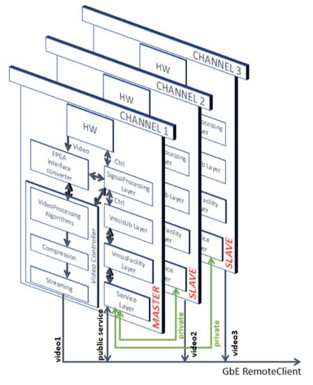 Another aspect of the development of the VVSP module is the software design, which was carried out completely at the Vlatacom Institute, with basic architecture shown in Figure 10. From the software side, the VMSIS3 system is a standalone, electronic device that produces imagery data using one or more image sensors and optical devices in different electromagnetic spectrum ranges and provides these data in the form of a video stream to end-user devices or applications. The VMSIS3 also provides control and monitoring of various operational parameters of the system. If we consider the VMSIS3 system from the communication side, it is in fact an Ethernet network device that is controlled via a single IP address, which sends a video stream via multiple IP addresses. These IP addresses are used by end-user devices and applications, designated as remote clients, to accept the provided video stream, as well as to access the public services of the VMSIS3 system.