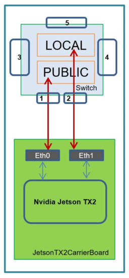 In order to fully enable the distributed architecture applied in the VMSIS3 system, special attention is paid to the network architecture when designing the VVSP module. On the application processor, two network cards (NIC) are integrated within the VVSP module, so that the processor has two access ports to its integrated managed Ethernet switch. This implementation allows each VVSP module to have two separate networks, private and public, as shown in Figure 11, in order to improve the security of the entire system.