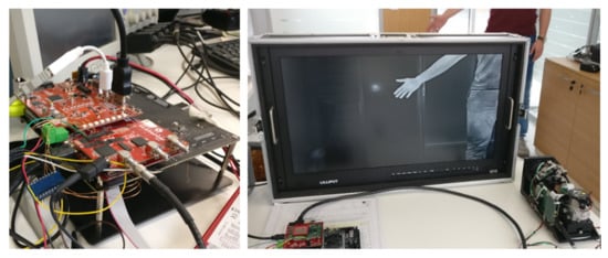 In Figure 14, parts of the VVSP module are shown during the development stage. On the left image, a stack of PCB boards, which includes the first revisions of JCB and FCB boards with AnSDif interface board, IMU sensor board and wires, is connected to an oscilloscope for testing and debugging. At this stage of project development, testing of video and communication interfaces is done at the hardware level. On the right image, testing of a part of a video pipeline via the FPGA processor before it comes to the main application processor for further processing is performed. A video stream is gained with signal acquisition and FPGA preprocessing from thermal camera and is shown on the output monitor.