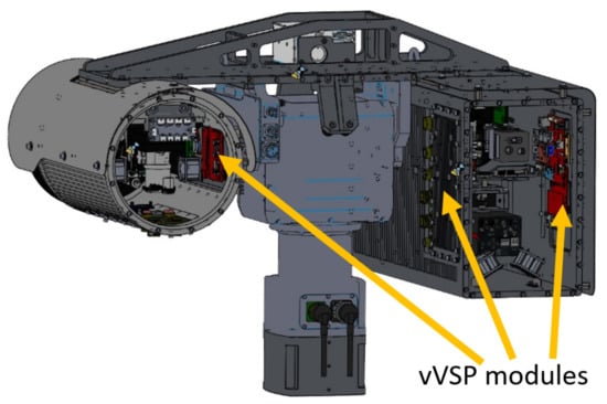 The usage of the implemented passive cooling allows smooth operation of any VMSIS3 system in the temperature range from −25 °C to +55 °C of ambient temperature. Once installed in the VMSIS3 device channel, the VVSP module becomes hermetically sealed, since it is of great importance to stop the penetration of moisture inside the channel to prevent any physical damage that moisture can cause to electronic components. An example of an integrated VVSP module connected with other equipment in the system is shown in Figure 17. This example shows the complexity of the arrangement of components within the EO system and how little space is set aside for the VVSP module. This is precisely the reason why the miniaturization of the video signal processing module was necessary. As a result, the VVSP module can be used not only in stationary applications, but it can also be integrated in vehicles where it is mounted on a pull-out pillar. An example of positioning all VVSP modules with passive cooling solution in a VMSIS3 system with T-shape pan-tilt is shown in Figure 17.