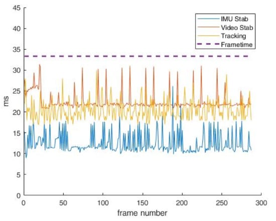 Since testing for algorithms’ execution time when the frame rate is 30 frames per second shows perfect results with no skipping of frames, the second test is performed with video streaming when the frame rate is 60 frames per second. In Figure 19, the time of execution of every applied algorithm when streaming a VGA-resolution video of 60 frames per second is shown. It is shown that not every frame in this case will be transferred, since video stabilization and tracking algorithms cannot always finish their calculations in time before the next frame comes to signal processing. In this case, the percentage of dropped frames is about 2–3%, as shown on Figure 19, which is irrelevant for the human eye.