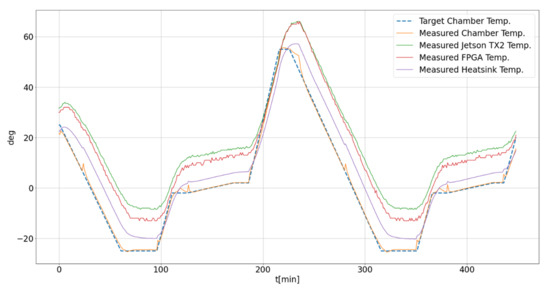 The VVSP module is subjected to testing in different temperature ranges via a programmable heat air circulation environmental chamber. The goal of this experiment is to test the functionality of the developed device in temperature range from −20 °C to +55 °C and to check the behavior of the system in extreme temperatures. The time of exposure of the VVSP module to extreme temperatures is from 25 to 40 min. By exposing our hardware to the temperature test, special attention is paid to temperature changes from −2 °C to 2 °C, since in this temperature zone, condensation can be a huge factor that can possibly damage the hardware, so that the transient is programmed to last longer. Heatsink and ambient temperature measurement is achieved with contact temperature sensors, while the temperature measurement of the FPGA module and NVIDIA Jetson TX2 is performed using their internal temperature sensors. Samples from each sensor are acquired by specially designed application to accept data from each sensor every 60 s and recorded.