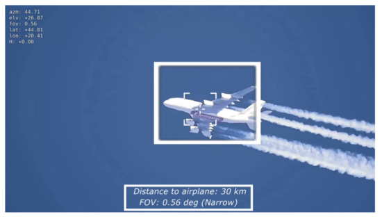 During the testing phase of the VVSP module employed in the VMSIS3 system, long-distance target tracking was tested from a rooftop of our Institute. Figure 21 shows the tracking algorithm performance when the commercial aircraft was spotted at a distance of 30 km, and it was successfully tracked.