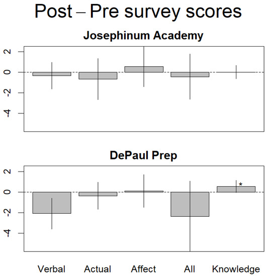 Changes of environmental attitudes sorted by assessment type. Results are based on the net change of survey scores for each attitudinal subscale. Josephinum Academy had a sample size of n = 19 responses, and DePaul Prep had a sample size of n = 9 responses. * Indicates the result would have been significant with a two-tailed t-test.