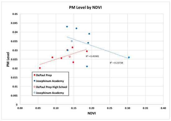 PM versus NDVI concentration for each experiment. The monitoring sites were student homes (closed circles) and each high school (open circles). The linear regression model is included for average PM concentrations and NDVI across each of the included monitoring sites (n = 7 for both Josephinum and DePaul Prep). For Josephinum, r2 = 0.24 and for DePaul Prep, r2 = 0.46.