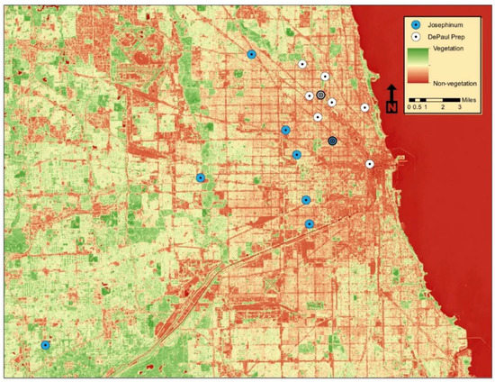 Spatial analysis of NDVI and PM concentrations. The points display the monitoring sites, colored white and blue to distinguish between DePaul Prep High School and Josephinum Academy. The NDVI layer depicts a color scale in which vegetation is green and non-vegetation is red. The Landsat 8 OLI/TIRS imagery from 12 September 2016 was acquired through the U.S. Geological Survey’s EarthExplorer. For visual purposes, we are using the Landsat image from the Josephinum experiment. The two points with concentric circles indicate the two study high schools.