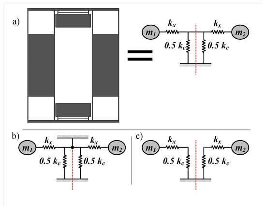 Drive stiffness network analysis. (a) Simplified TFG design and its equivalent mass-stiffness network in drive direction, with the coupling stiffness split into two parallel stiffnesses (b) The out-of-phase mode where the red line is a virtual anchor (c) The in-phase mode where any connection on the red line can be opened because both masses are in an in-phase motion.
