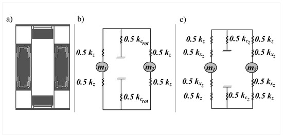 The proposed structure for our TFG is shown in Figure 2. Each side consists of four fixed-fixed beams (X-beams) from each side to act as springs in the drive directions (X-spring), an outer frame, an inner mass, and six serpentine structures (Z-serpentine) to act springs in the sense direction (Z-spring). In this structure, the two masses are driven in opposite direction and are coupled by two symmetric upper and lower coupling mechanisms in order to ensure the coupled operation. The rotation axis is x directions and the Coriolis force acts in the z direction deferentially on both masses which act as capacitor plates used to sense this force. To understand the nature of the coupling and calculate the in-phase and out-of-phase drive frequencies, the network is analyzed as shown in Figure 3, splitting the coupling stiffness to two parallel stiffnesses to be able to perform in-phase and out-of-phase analyses. Since the masses are moved together in the same direction, the in-phase mode, the link between them in the network is insignificant and can be removed as shown in Figure 3c. In consequence, the in-phase mode drive frequency can be formulated as: