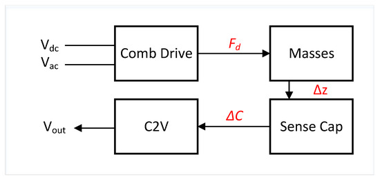 where and are the capacitance of the rising and falling masses, respectively, A is the capacitor area and, is the nominal gap between the moving mass and top electrode. Since the vertical displacement is very small compared to the gap, the capacitance signal can be very well approximated as: