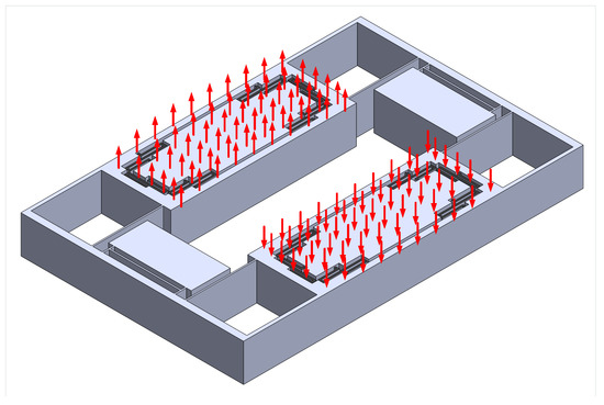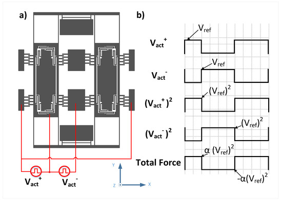 One way of applying the voltage is shown in Figure 7. The voltage is applied as a square wave with variable duty cycle and an amplitude of as maximum value while 0V as minimum value. So the resultant force on the mass is also a square wave but with an amplitude proportional to as maximum value while zero N as minimum value and with the same duty cycle. Moreover, we have the voltage signal to be out-of-phase at the two sides of the mass.