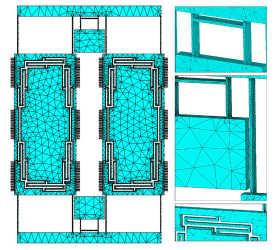 FE mesh elements and nodes. The inserts on the right show finer meshing on the suspensions compared to the proof mass.