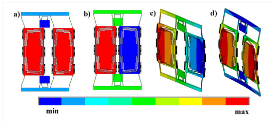 The first four mode shapes of the design (a) First drive in-plane (in-phase) mode shape. (b) Second drive in-plane (out-of-phase). (c) First sense out-of-plane (out-of-phase) mode shape. (d) Second sense out-of-plane (in-phase) mode shape.