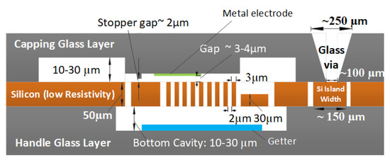 In addition, the fabrication process should offer a good vacuum encapsulation to ensure high quality factor for the drive and sense mechanical modes. The vacuum level will need also to be stabilized and last for long period without possible internal out-gassing leading to the increase of the pressure and thus lower the quality factor due to the fluid damping mechanisms. Introducing a getter layer ensures the stability of the vacuum level achieved during the encapsulation process.