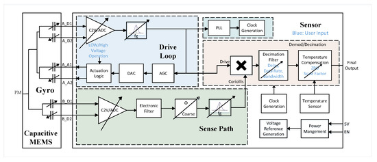 ASIC system consists of the sense path, the drive loop, and output decimation filter controlled by the user. In addition, a temperature sensor is included to compensate the interface through temperature compensation circuit.