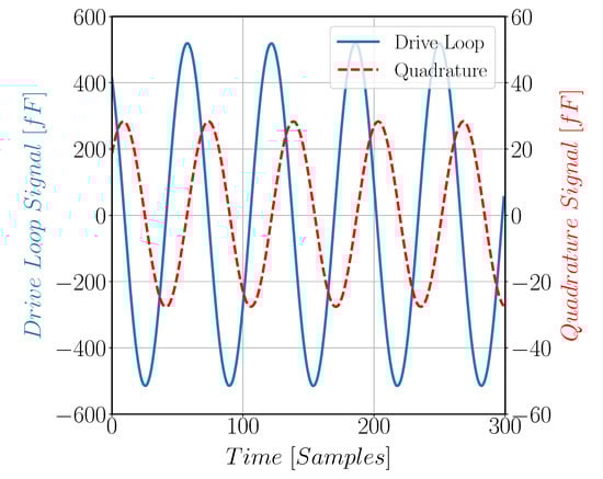 The proof mass motion in both the drive and sense directions at zero rate input velocity. The two signals were taken at different occasions.